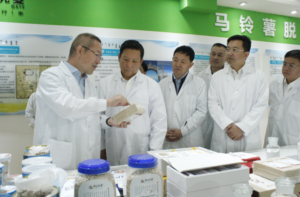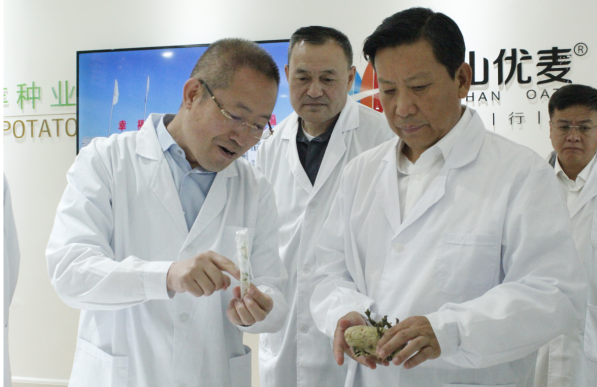 段志強一行首先參觀了民豐種業(yè)脫毒組培中心展廳,詳細了解了馬鈴薯脫毒種薯生產(chǎn)過程及企業(yè)發(fā)展情況。張國介紹,內(nèi)蒙古民豐種業(yè)有限公司成立于2008年,注冊資本1.3億元,已累計完成投資10億元以上,公司已發(fā)展成為集馬鈴薯種薯、訂單薯生產(chǎn)及馬鈴薯、燕麥深加工于一體的全產(chǎn)業(yè)鏈集團化企業(yè),是“農(nóng)業(yè)產(chǎn)業(yè)化國家重點龍頭企業(yè)”、“國家高新技術(shù)企業(yè)”、“自治區(qū)扶貧龍頭企業(yè)”。目前,公司已發(fā)展成為一家融合農(nóng)業(yè)和食品加工業(yè)的全產(chǎn)業(yè)鏈集團化公司,形成以食品加工帶動農(nóng)業(yè),以農(nóng)業(yè)服務食品加工,一、二、三產(chǎn)融合、農(nóng)商互聯(lián)齊頭并進的良性發(fā)展業(yè)務格局。